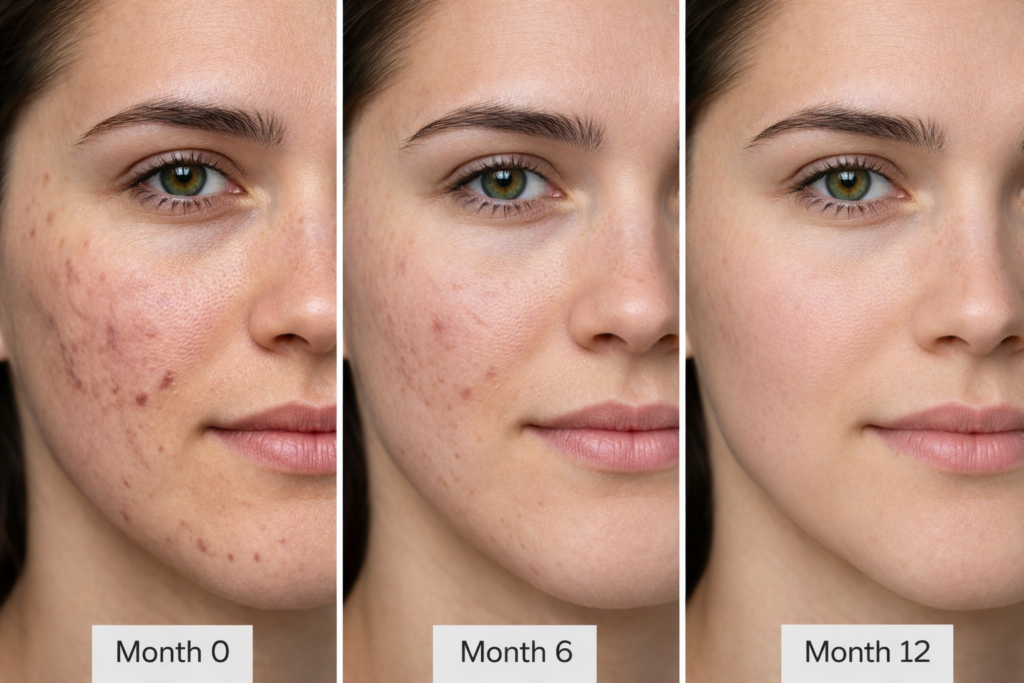 For PIH marks: expect gradual fading over 6-18 months. For structural scars: professional treatment required regardless of age. Starting treatment early—late teens or early 20s—yields dramatically better results.